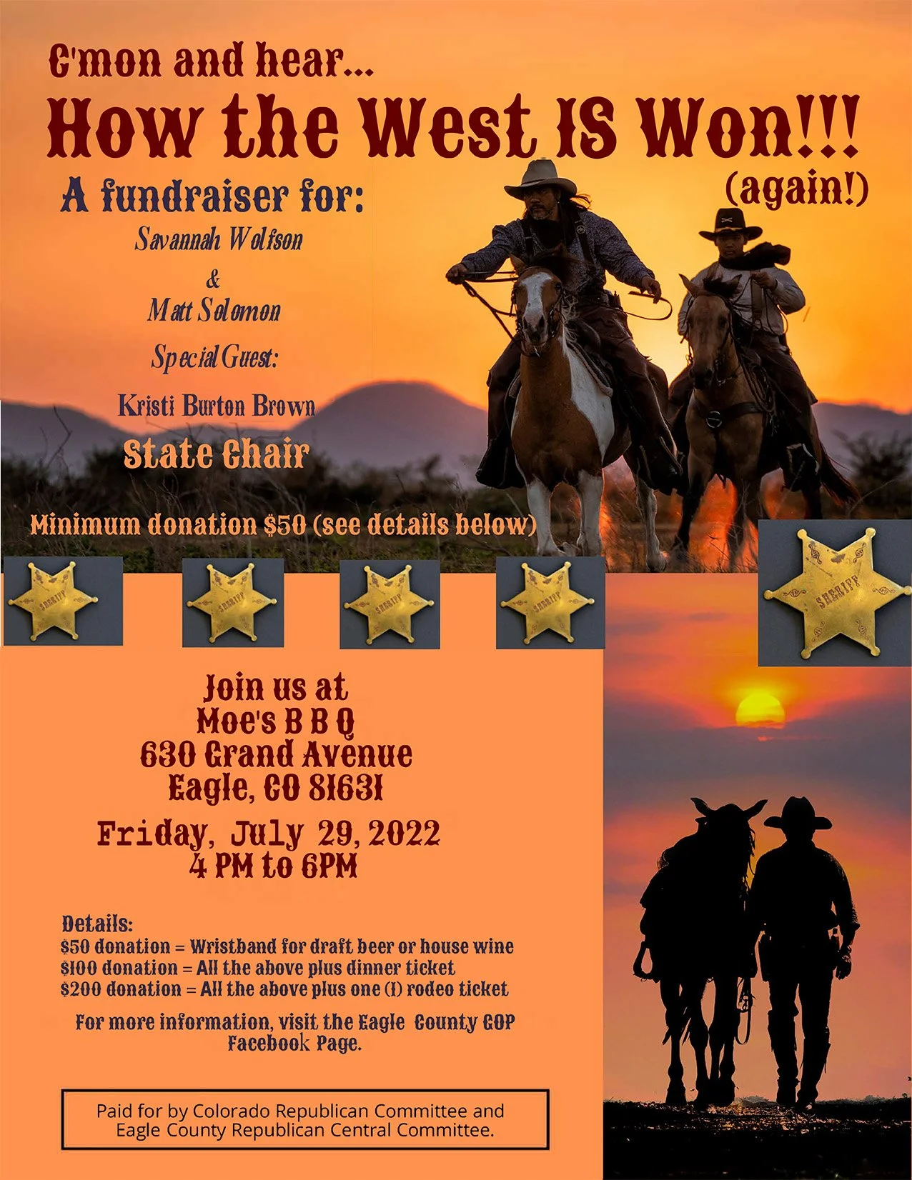 Fundraiser for Savannah Wolfson (HD26) and Matt Solomon (SD8) Friday, July 29, 2022 4:00 PM 6:00 PM Moe's BBQ 630 Grand Avenue Eagle, CO, 81631 United States (map) Google Calendar ICS